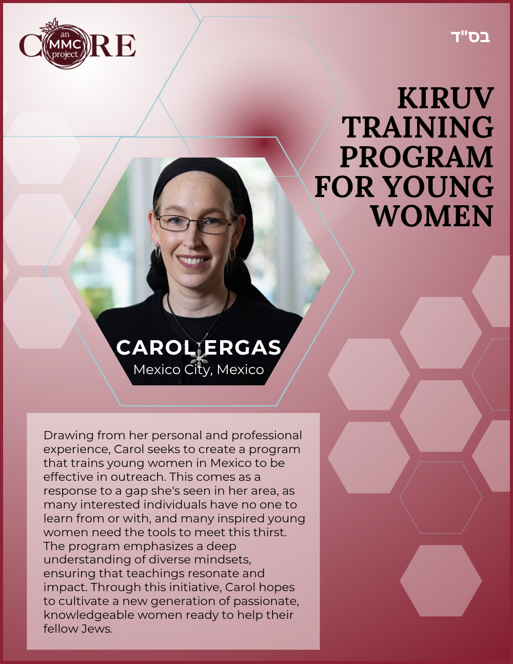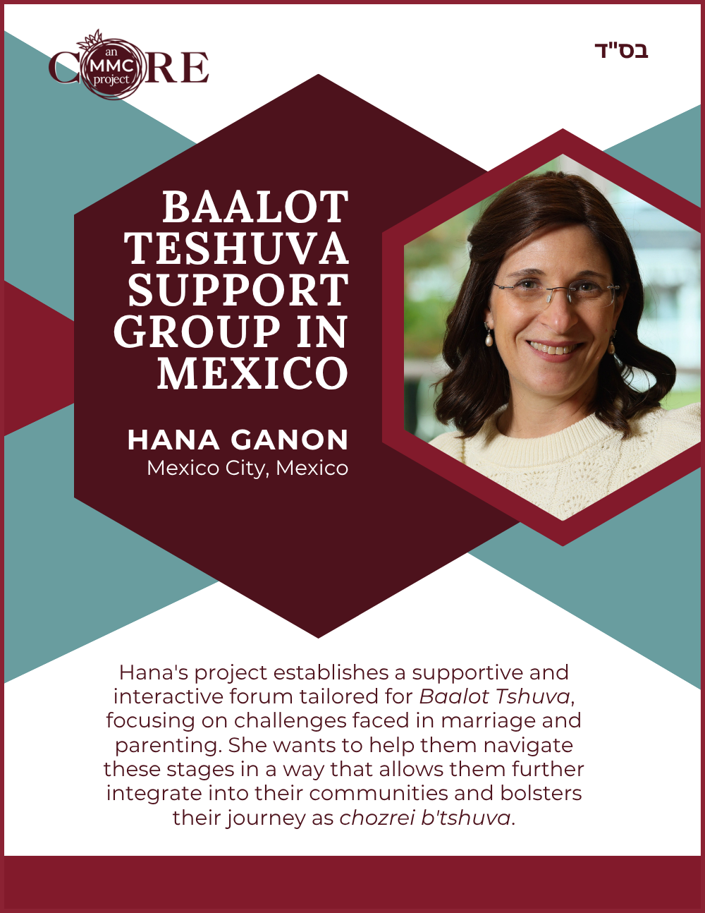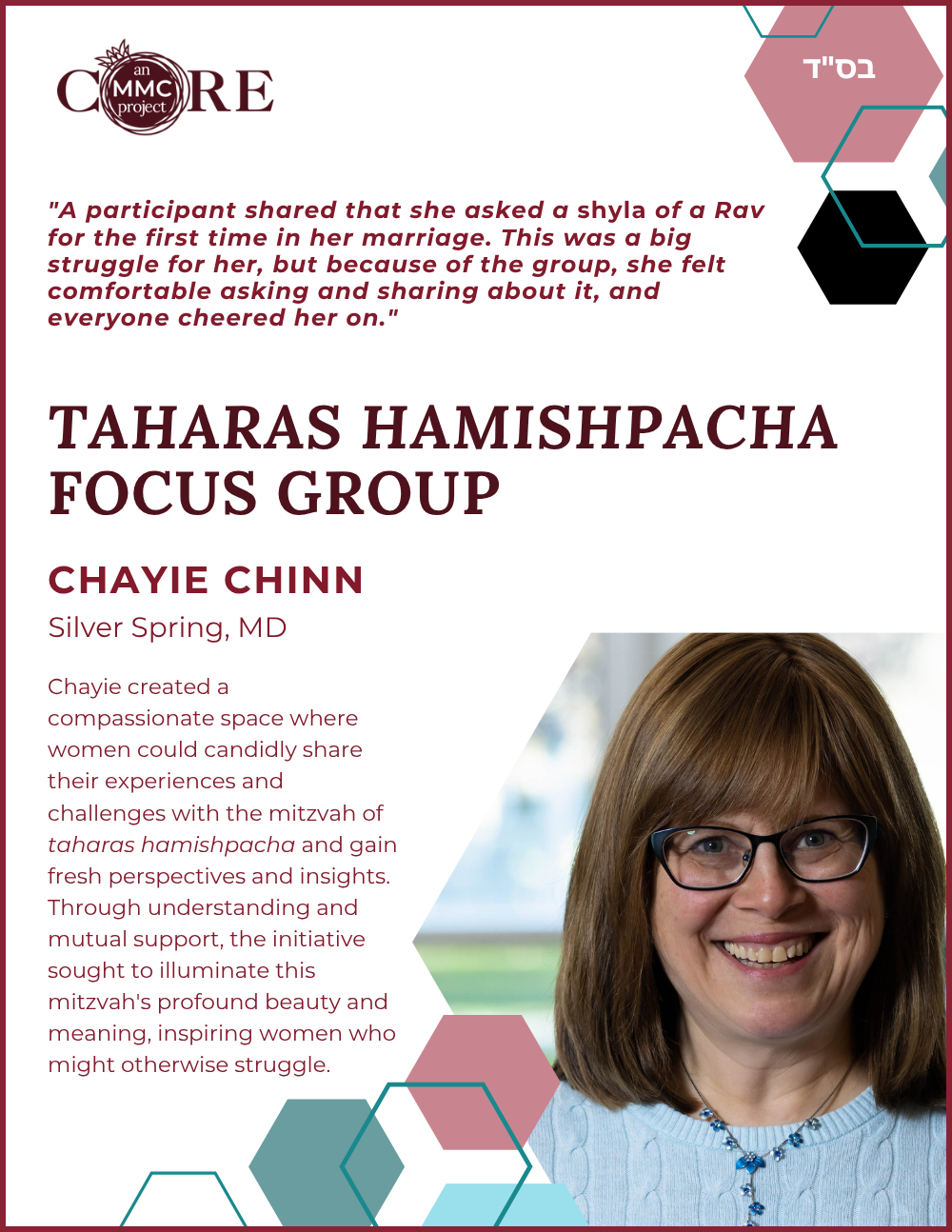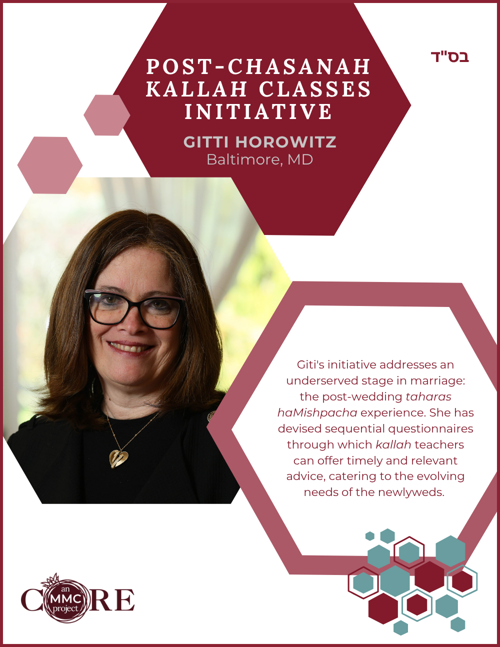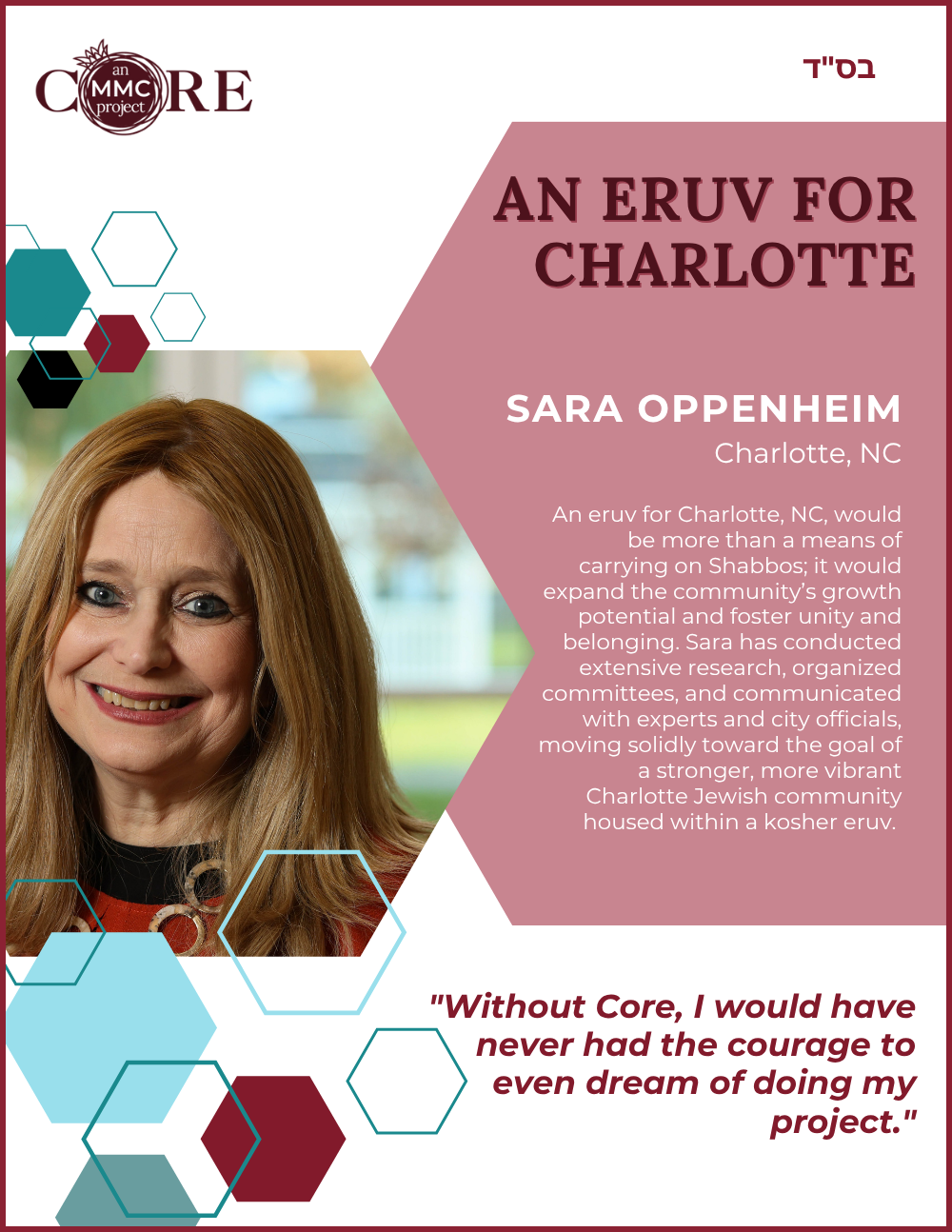 While at Aish, she founded N-Aish-Ay, a mentoring network for the wives of future rabbis, and later launched Women of Wisdom (WOW) in Charlotte. Her Core MMC capstone project led to the creation of Charlotte’s first kosher eruv.