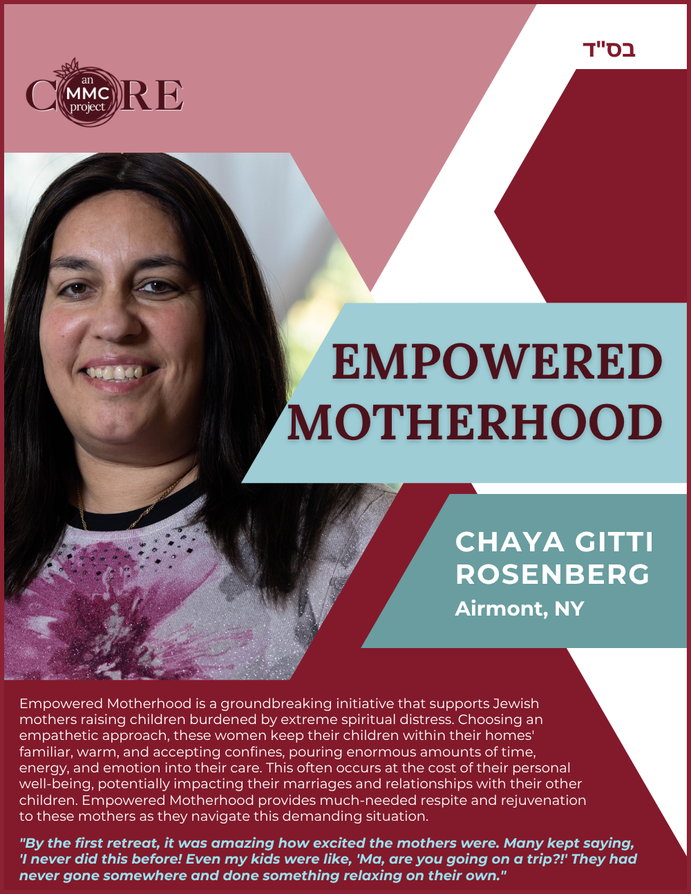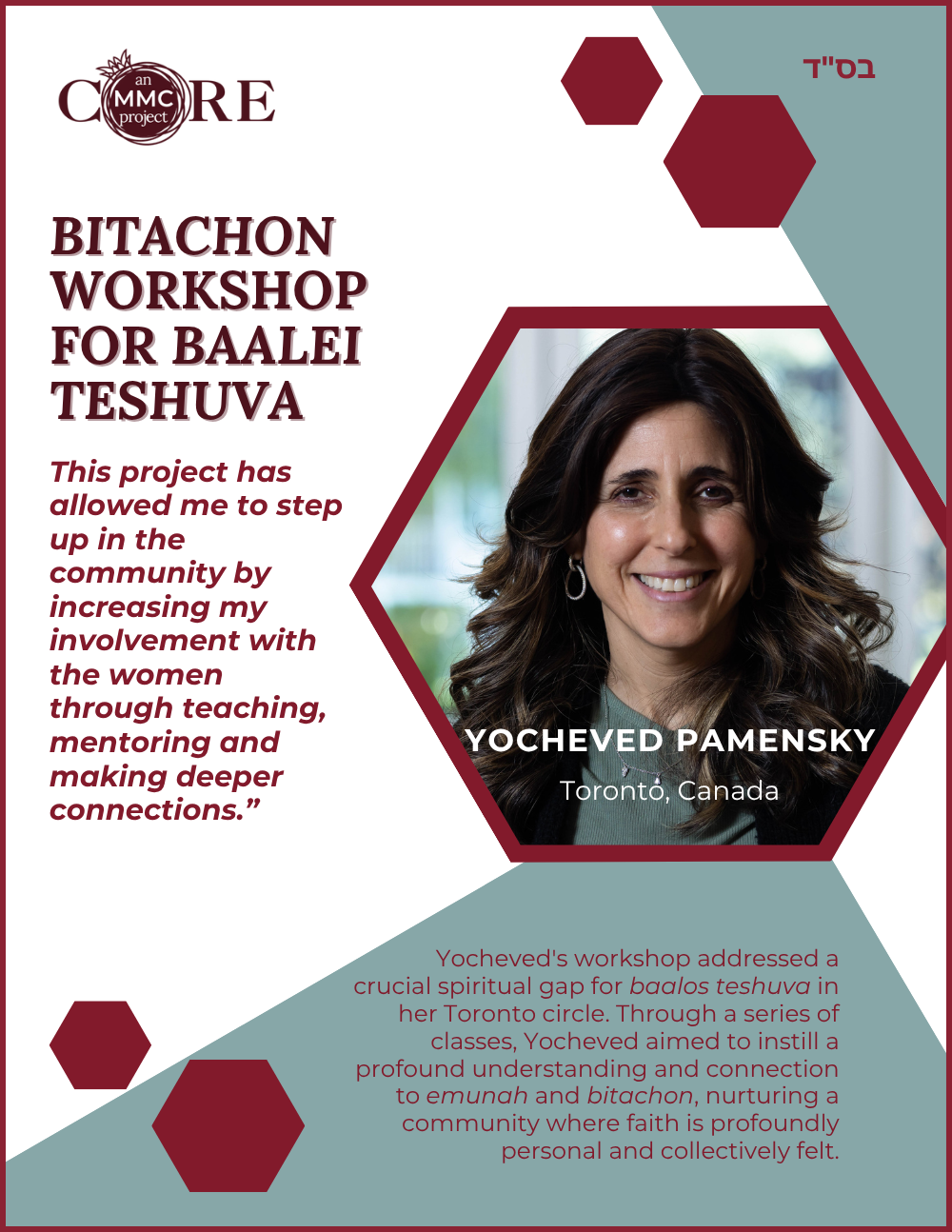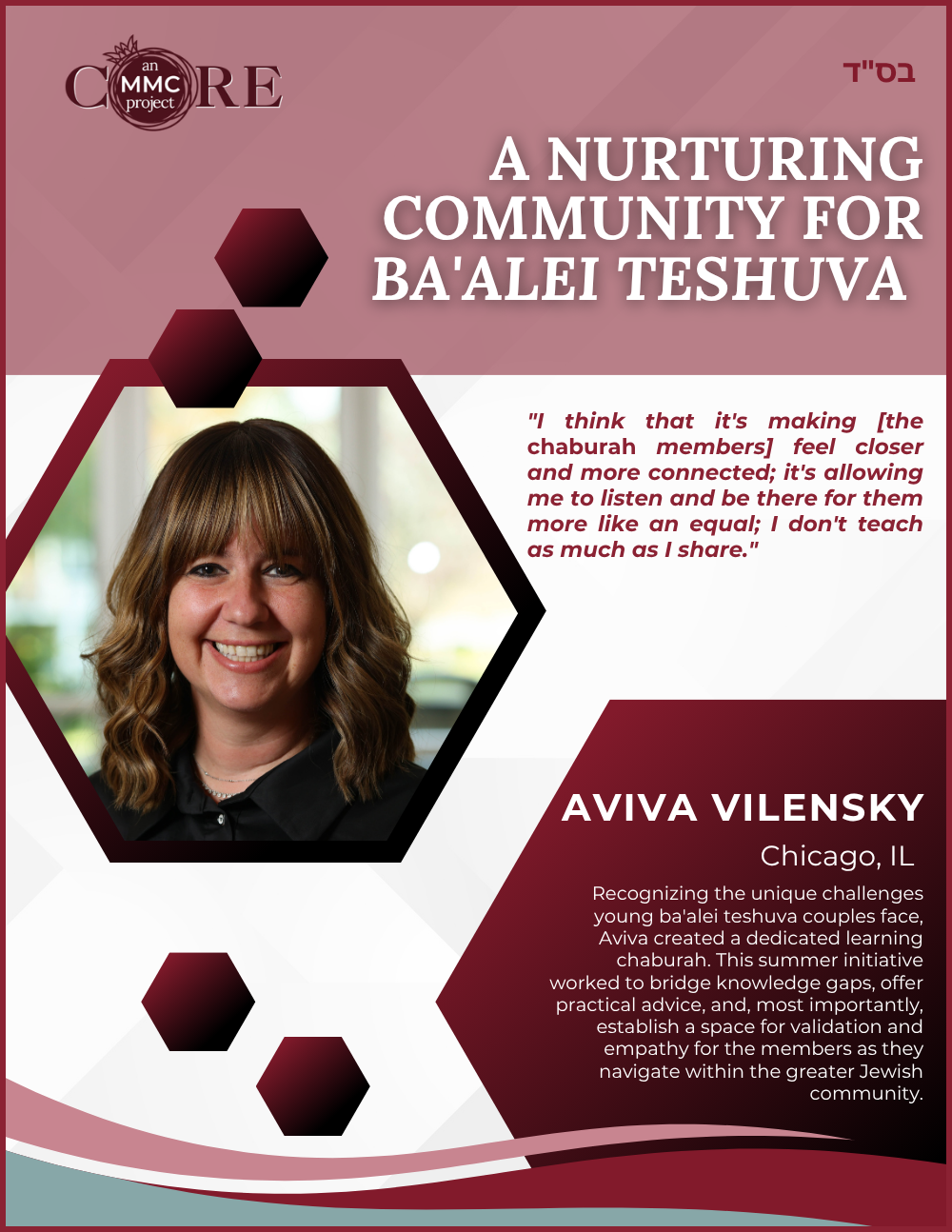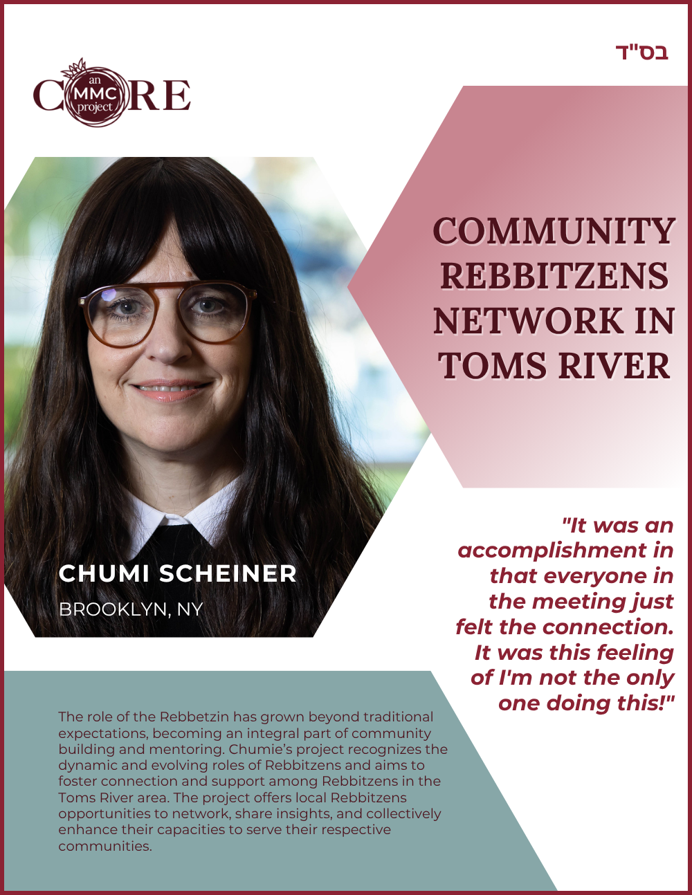 While at Aish, she founded N-Aish-Ay, a mentoring network for the wives of future rabbis, and later launched Women of Wisdom (WOW) in Charlotte. Her Core MMC capstone project led to the creation of Charlotte’s first kosher eruv.