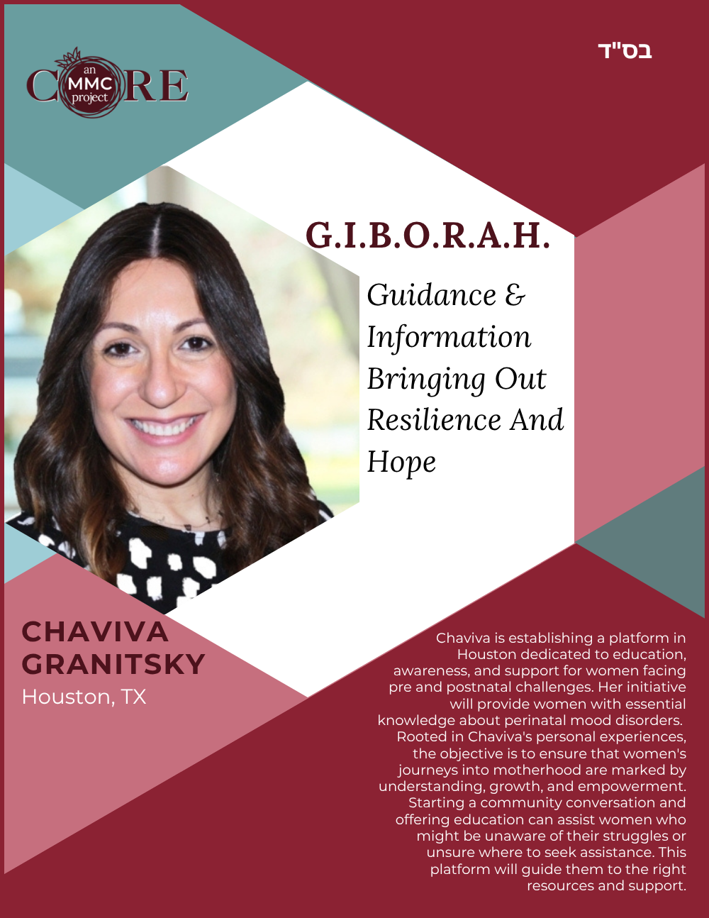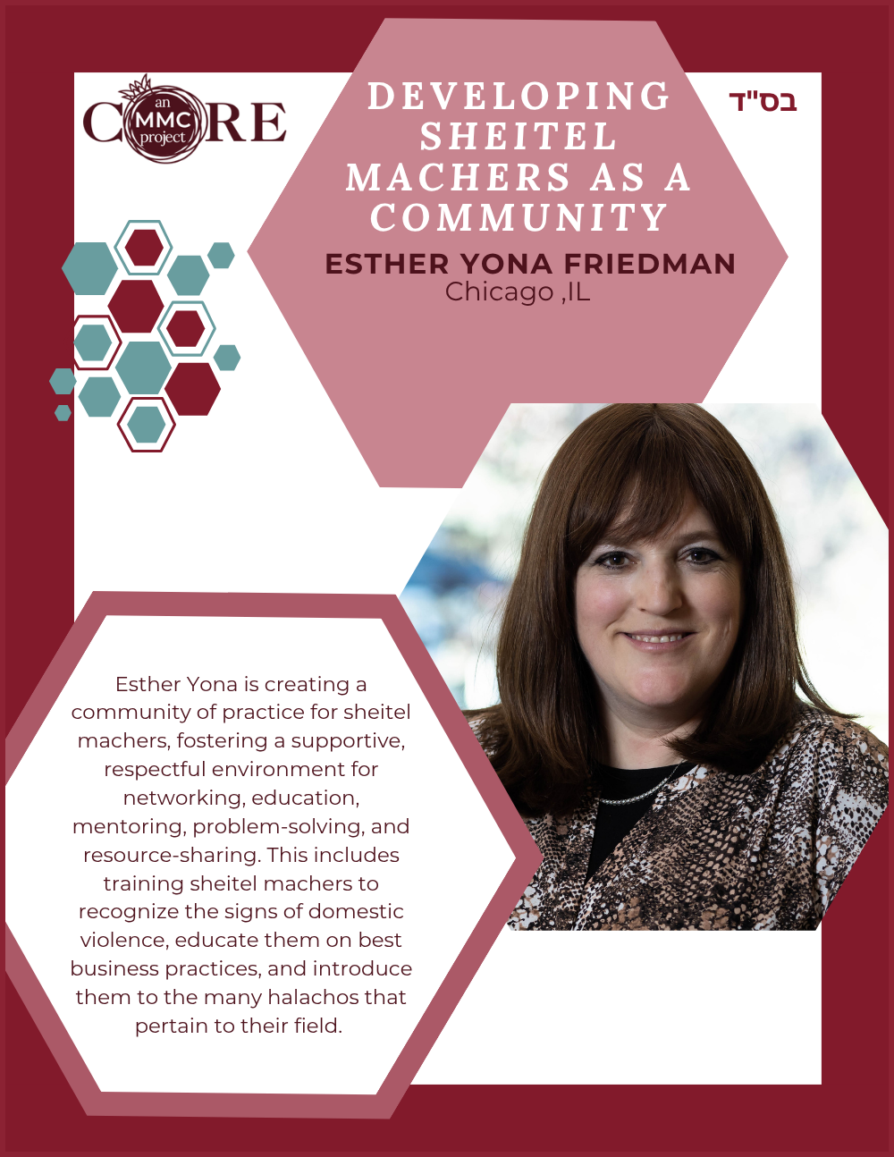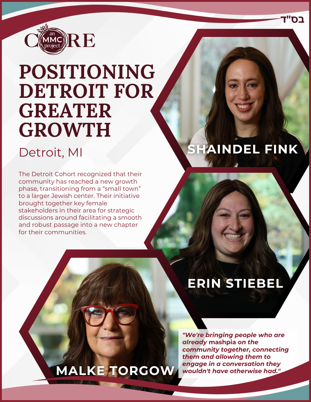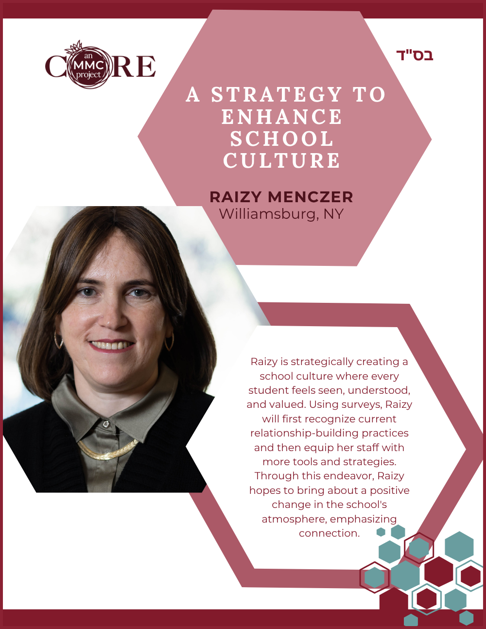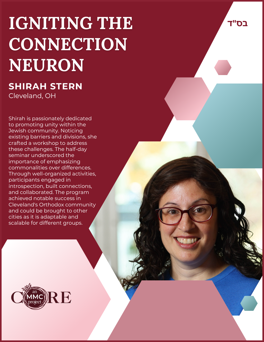 While at Aish, she founded N-Aish-Ay, a mentoring network for the wives of future rabbis, and later launched Women of Wisdom (WOW) in Charlotte. Her Core MMC capstone project led to the creation of Charlotte’s first kosher eruv.