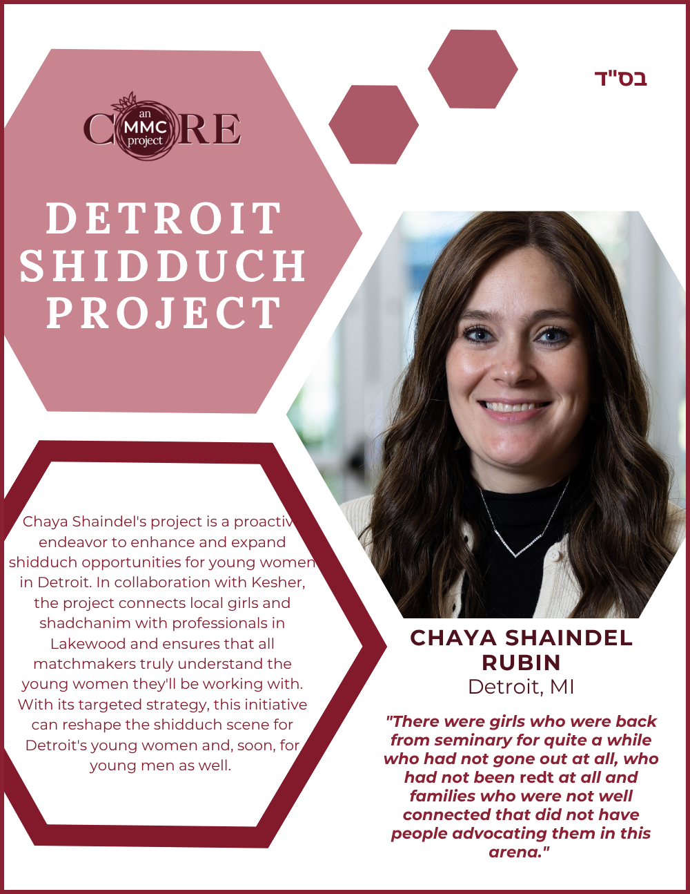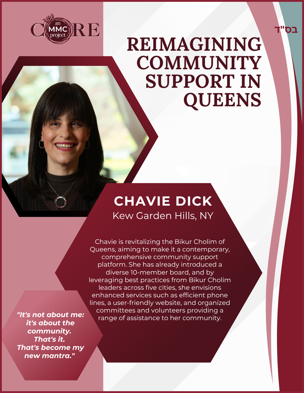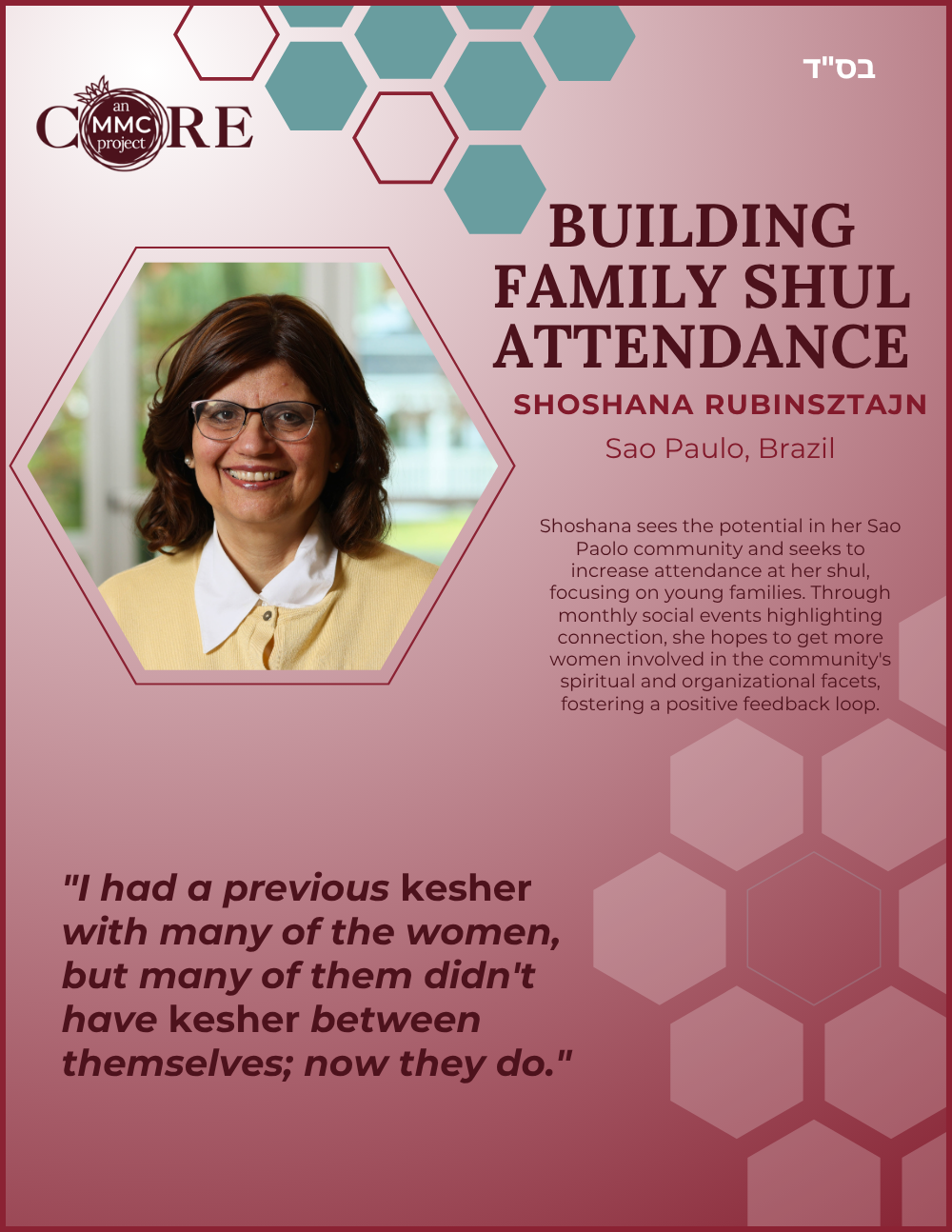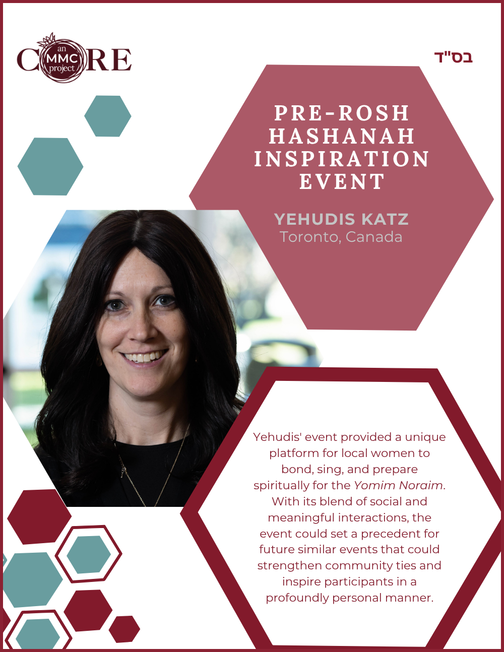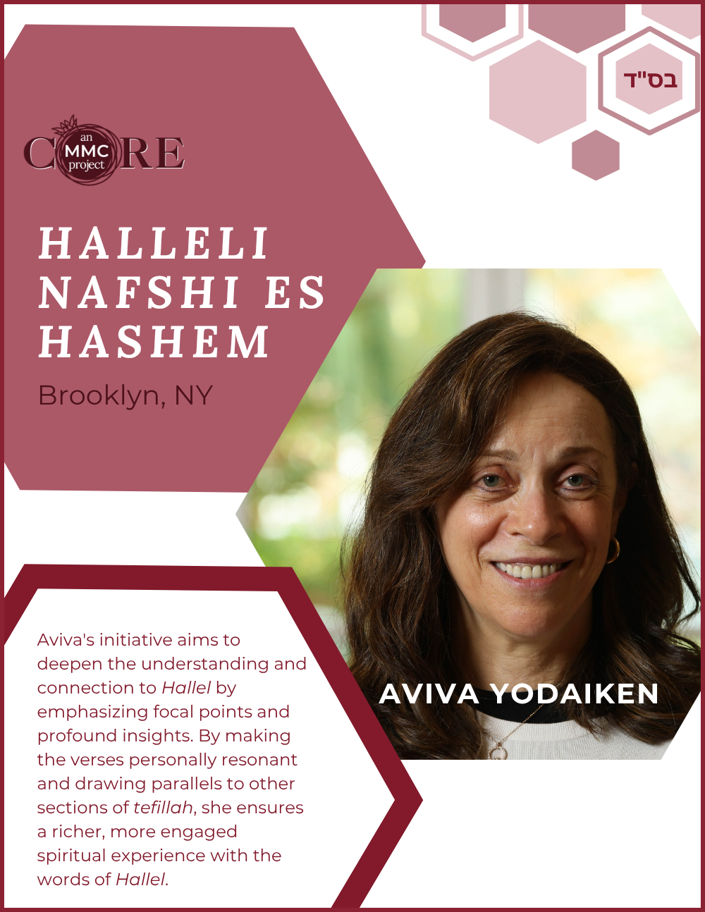 While at Aish, she founded N-Aish-Ay, a mentoring network for the wives of future rabbis, and later launched Women of Wisdom (WOW) in Charlotte. Her Core MMC capstone project led to the creation of Charlotte’s first kosher eruv.