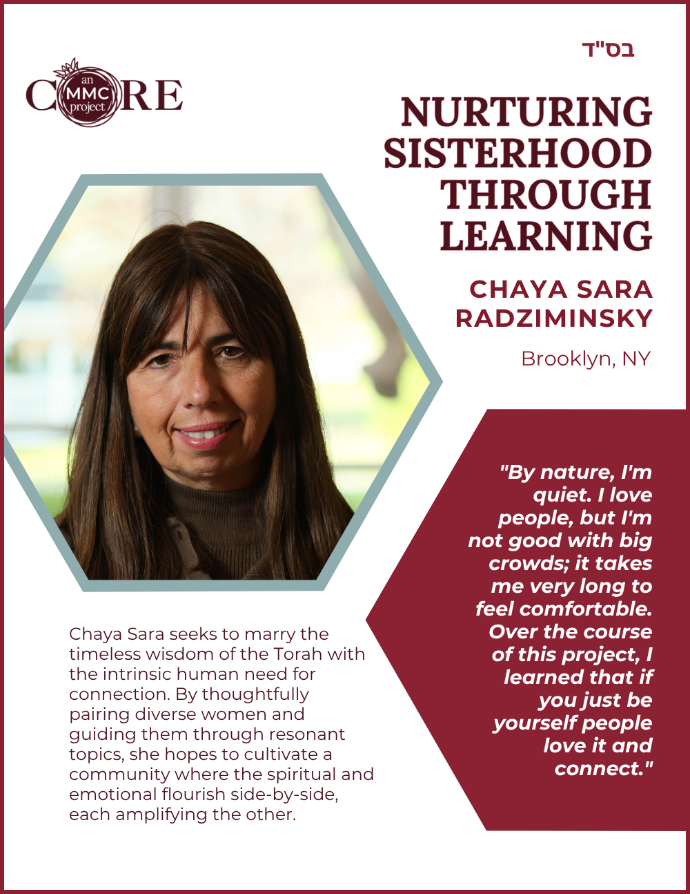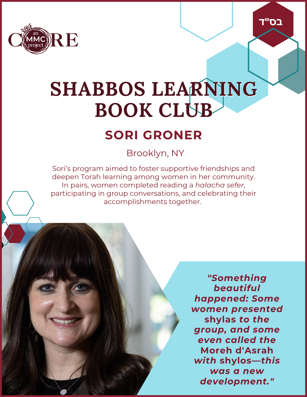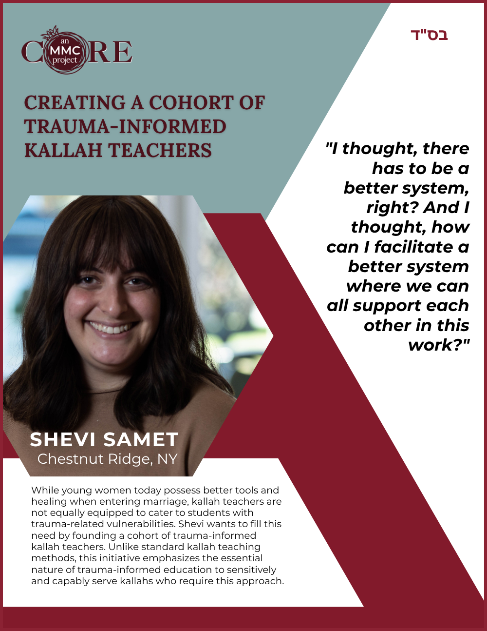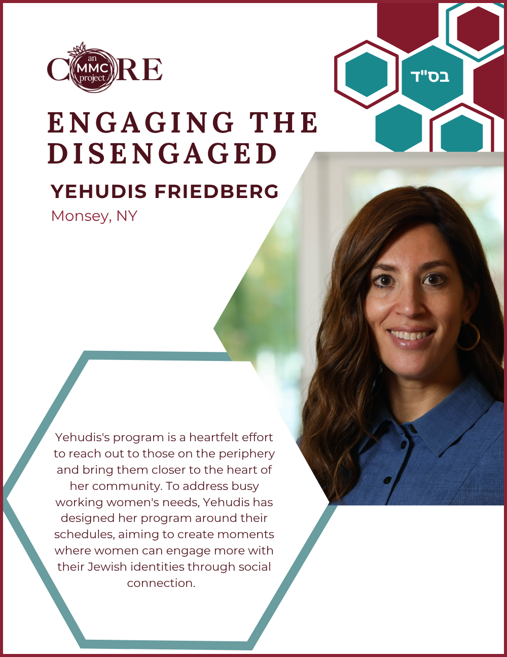 Sara currently serves as Co-Director of Education for Core’s Mashpia Mentor Counselor (MMC) Training Program—a rigorous two-and-a-half-year initiative that equips women to provide Torah-based spiritual mentorship and emotional support within their communities.